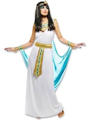 Queen Cleopatra portrays beauty in this white gown with gold and sea blue accents. Includes attached sheer cape w/cuffs, belt, neckpiece and Asp headpiece. 100% polyester stretch. Dry clean only.