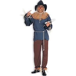 Scarecrow costume is a licensed version that includes jersey pants, jersey hood with fleece collar, felt hat, rope ties. Can add straw ties to make hair or additional stuffing look, see below.